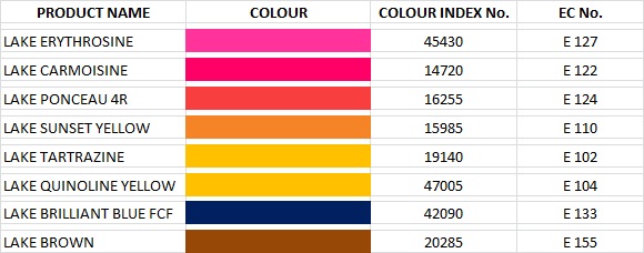 - Lakes are suitable for products containing oils and fats as well as those lacking sufficient moisture to dissolve Colours.